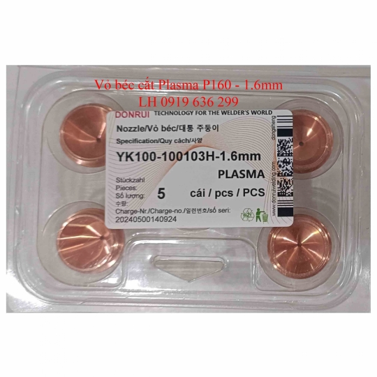 Béc cắt Plasma P160 1.6mm (Bao gồm vỏ béc và điện cực). Ứng dụng đa dạng: Béc cắt kích thước 1.6mm phù hợp để cắt nhiều loại vật liệu khác nhau như thép, nhôm, đồng, và inox với độ dày vừa phải. Công nghệ Plasma ít tạo ra khói bụi và tia lửa so với các phương pháp cắt khác, giúp môi trường làm việc an toàn hơn. Liên hệ 0919636299