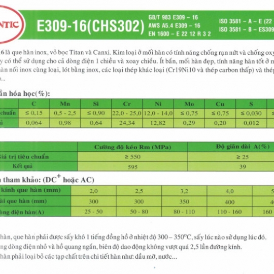 - Que hàn inox 309 có hàm lượng Mangan trung bình, tạp chất Lưu huỳnh, Photpho vô cùng nhỏ tạo ra mối hàn có độ bền và độ dẻo dai cao. Đặc biệt với hàm lượng Crôm, Niken cao đảm bảo hệ kim loại mối hàn có tính chống gỉ, chống ăn mòn và chỉ tiêu cơ tính rất cao.