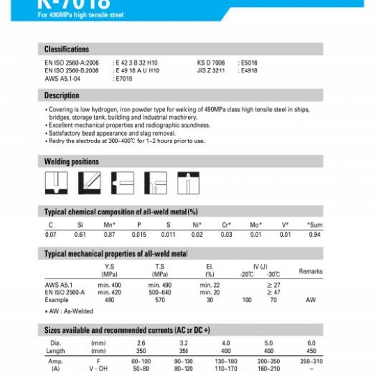 Que hàn K7018 – 3.2mm (Kiswel) thuộc loại que hàn điện bọc thuốc, đáp ứng các tiêu chuẩn về độ bền AWS A5.1 và EN ISO 2560-A. Cụ thể, theo AWS A5.1 thì độ bền kéo và bền chảy của que hàn có thể đạt mức 400 – 490 Mpa, với độ giãn mối hãn chỉ từ 22% là vô khoảng giá trị độ bền lý tưởng, có thể hoạt động trong nhiệt độ cao.